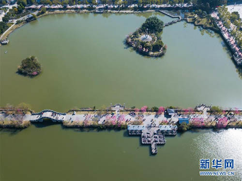 3月11日,游人在福建農(nóng)林大學(xué)校內(nèi)賞花(無人機拍攝)。