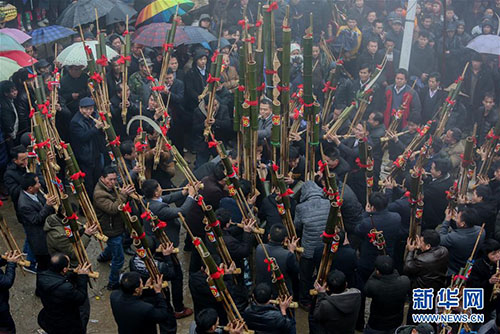 1月14日,人們在廣西融水苗族自治縣紅水鄉(xiāng)舉行的蘆笙節(jié)上賽蘆笙。
