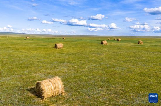 初秋時節(jié),內(nèi)蒙古呼倫貝爾大草原草色漸黃。在遼闊的草原上,牧民將豐收的牧草捆扎成卷,成群的牛羊、馬匹漫步其間,勾勒出一幅祥和美麗的秋日豐收圖景。