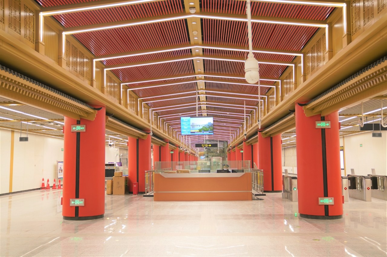 長(zhǎng)風(fēng)街站則以《西廂記》為靈感,提取中式園林月亮門元素,既展現(xiàn)出劇里的浪漫,又裹著中式園林的柔,營(yíng)造出“比翼雙飛”的浪漫氛圍。