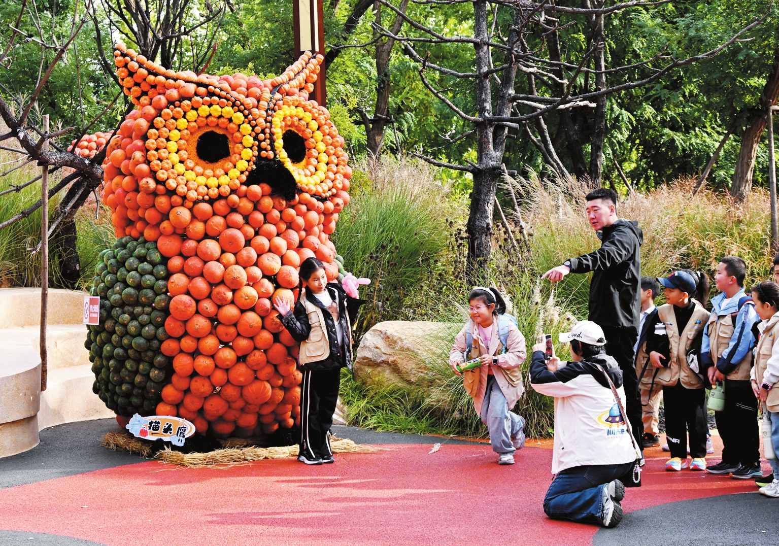 近日,青島東方伊甸園舉行“南瓜藝術(shù)王國(guó)”主題展。圖為小朋友在排隊(duì)與“南瓜貓頭鷹”合影。 新華社記者 李紫恒 攝