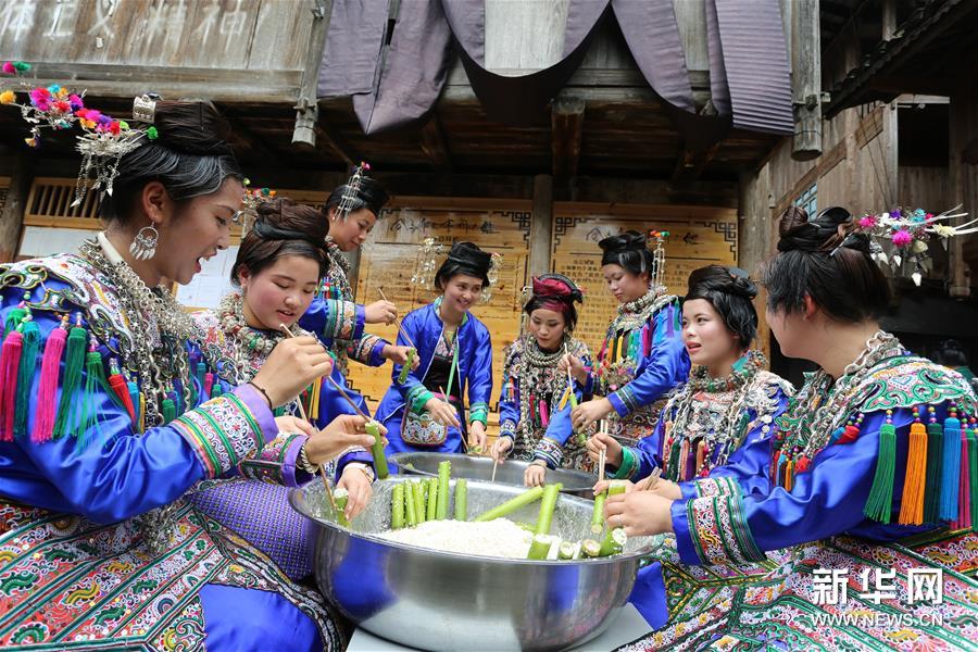5月3日,貴州省首批魅力侗寨——榕江縣烏公侗寨歡度傳統(tǒng)的竹米節(jié),重溫侗民遠(yuǎn)古農(nóng)耕風(fēng)情。竹米節(jié)也叫吃竹筍飯,在每年谷雨至立夏期間竹筍生長的時(shí)候,侗族群眾采摘斑竹筍,把糯米灌進(jìn)筍筒煮熟食用。這樣既能保持米飯的原味,又有竹筍的清香,并且還方便攜帶至坡上田間地頭食用。久而久之,侗族人每到春夏之交的農(nóng)耕時(shí)節(jié)都會(huì)過竹米節(jié),殺豬宰羊祭祀侗族祖先,唱歌跳舞祈求五谷豐登。新華社發(fā)(楊成利 攝) |