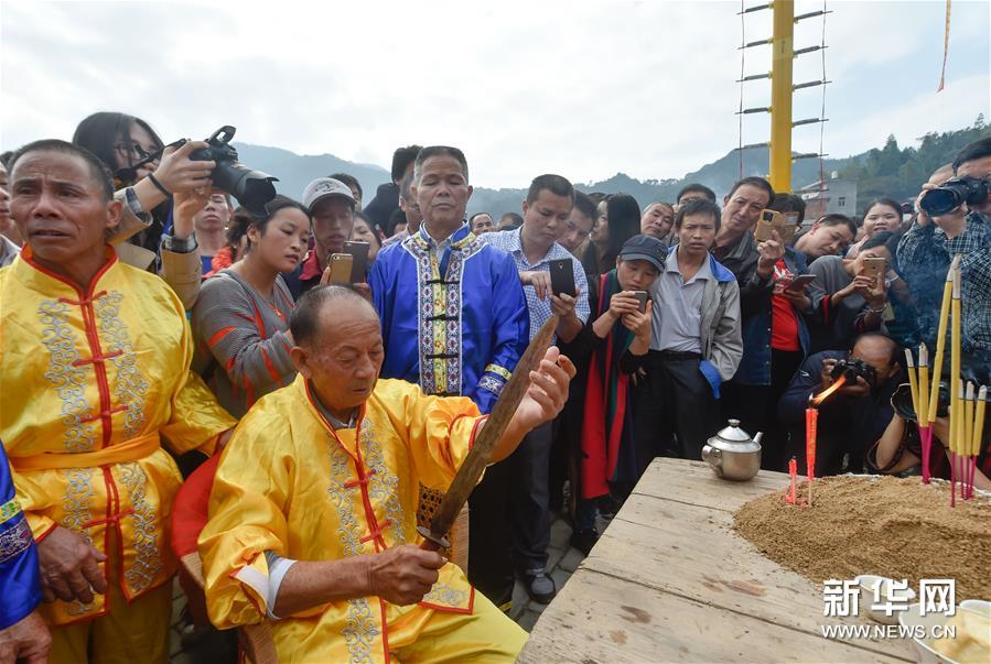 農(nóng)歷十月十五前后,福建西部武平縣各山村陸續(xù)進(jìn)入農(nóng)閑時節(jié)。按照當(dāng)?shù)仫L(fēng)俗,不同村子各自擇日舉辦民間活動,其中較有代表性的就是“上刀山”絕技?!吧系渡健苯^技在閩西山村流傳已有數(shù)百年歷史,表演者需光腳順著磨得鋒利閃亮的36把鋼刀,攀登至8米高的杉木柱子頂部,接受長者祝福,祈求風(fēng)調(diào)雨順、五谷豐登。新華社記者 宋為偉 攝