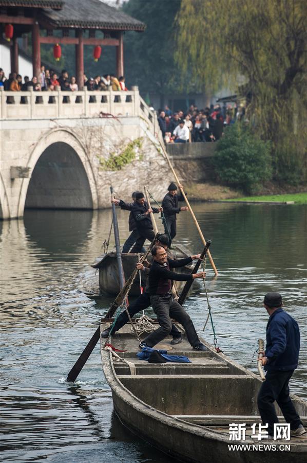 1月2日,浙江省紹興市柯橋區(qū)安昌鎮(zhèn)舉行水上拔河趣味表演。水上拔河是紹興水鄉(xiāng)的傳統(tǒng)活動,不僅是力量的較量,也是當(dāng)?shù)貍鹘y(tǒng)劃船技巧的展示。新華社發(fā)(張輝 攝)