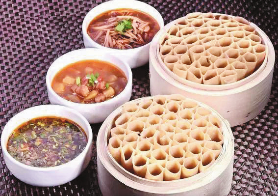 莜面栲栳栳。莜面栲栳栳又叫“莜面窩窩”,是過去老百姓農(nóng)忙時節(jié)為省事普遍愛做的一種飯食。它工藝講究,成形美觀,口感筋道,再加上“羊肉臊子臺蘑湯”,真可謂“一家吃著十家香”,難怪就連康熙皇帝朝拜五臺山時,也以品此為人生快事。其做法是:和面時加以燒開的水,用筷子攪拌成面絮,趁熱將其揉成光滑的面團;取一小塊放在光滑的面板上,用手掌使巧勁一搓,然后撕起來往食指上繞,卷成中間空的小卷,豎在蒸籠里;最后放在沸水鍋上蒸10分鐘即熟,蒸時要注意火候,火候不到會不熟,蒸得過火則軟癱立不起來,吃時味欠色減。