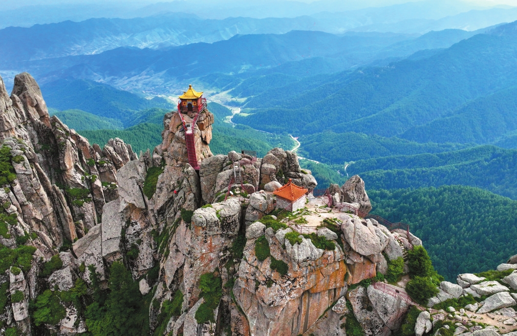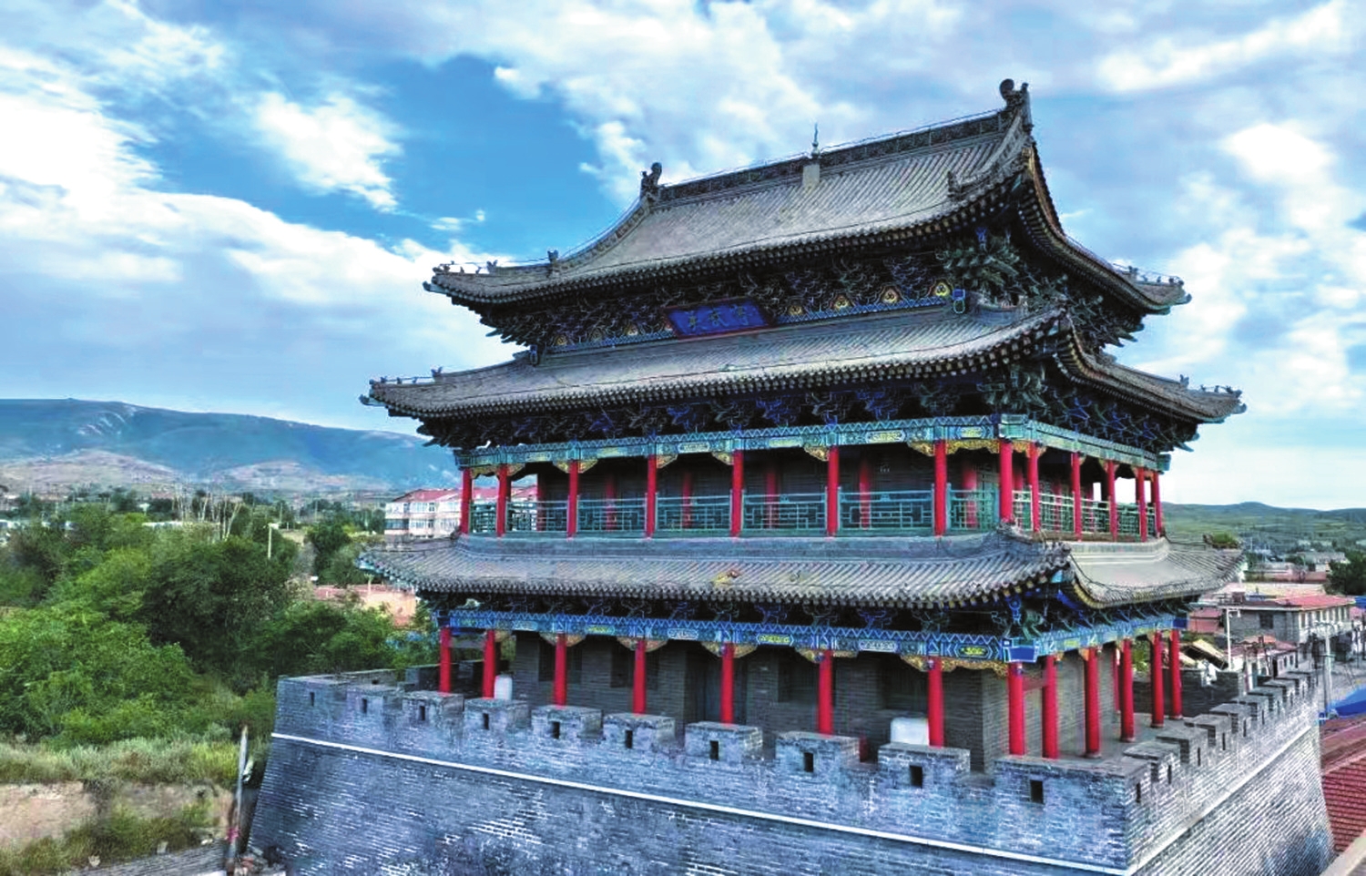 寧武關(guān)城樓。吳光宇攝 夫?qū)幬湔?,九塞鎖鑰,三晉翰屏。東據(jù)雁門(mén)關(guān)、巍巍紫塞,長(zhǎng)城逶迤難跨越;西擁偏頭關(guān)、滾滾黃河,天塹津渡足藩籬。居中策應(yīng),三關(guān)總兵運(yùn)帷幄;全局統(tǒng)籌,九州貔貅武衛(wèi)寧。古城新貌,美輪美奐;鳳凰涅槃,煥發(fā)青春。鳳鳴閣丹鳳朝陽(yáng)振翮羽,龍吟亭青龍布雨發(fā)嘯聲。四大街各具特色,六區(qū)片別有風(fēng)情,三廣場(chǎng)調(diào)和鼎鼐,兩中心主次分明。涔山鐘靈,珍禽異獸之鄉(xiāng)、烏金銀鋁之境;噴珠濺玉之泉、抗霜御寒之林。汾水毓秀,鐵馬金戈之域、駝鈴商幫之垠;翰墨文采之士、堡壘關(guān)塞之雄。爾來(lái)悠悠三萬(wàn)載,人猿揖別棄小可;欣逢人民共和國(guó),披荊斬棘唱大風(fēng)。 穿越時(shí)光隧道,窺視歷史風(fēng)云。建置沿革,由來(lái)久矣。春秋戰(zhàn)國(guó),樓煩故地。趙武靈王胡服騎射,雁門(mén)郡所屬;秦漢西晉一統(tǒng)寰宇,樓煩縣所領(lǐng)。北魏設(shè)廣寧、神武二郡,隋唐置樓煩、寧武兩軍。宋遼金元,寧化縣、寧化軍賡續(xù);洪武成化,千戶所、寧武關(guān)雙成。滿清設(shè)寧武府、寧武縣,府縣同治;民國(guó)則覆帝座、倡共和,府廢縣存。樓煩駿馬甲天下,頭馬營(yíng)、二馬營(yíng)、三馬營(yíng),騏驥騰驤、鐵馬金戈護(hù)桑梓;樓煩自古征戰(zhàn)地,東馬坊、中馬坊、西馬坊,骕骦馳騁、銀槍玉斧衛(wèi)山陵。御山部、匈奴,馬蹄踏踏;融鮮卑、契丹,戰(zhàn)旗獵獵;拒瓦剌、韃靼,鼙鼓震震??谷諔?zhàn)爭(zhēng),血火淬礪;解放戰(zhàn)爭(zhēng),狂飆突進(jìn)。新中國(guó)東方崛起,寧武縣風(fēng)騷獨(dú)領(lǐng)。 巍巍乎寧武之山。山地之廣,晉省首屈一指;山峰之險(xiǎn),堪比華岳崢嶸。左峙云中山,萬(wàn)年憑恃;右領(lǐng)管涔山,千里綿亙。荷葉坪三縣鼎盛,高山草甸鋪翠黛;蘆芽峰一枝獨(dú)秀,太子宮殿攬赤云。九十九座峰巒,層巒疊嶂、聳峙崚嶒,披蒼堆翠、險(xiǎn)阻壁壘大氣象;九十九處寶藏,峻峭崔嵬、嶙峋府庫(kù),薈萃蘊(yùn)精、洞天福地小蓬瀛。一夫當(dāng)關(guān)兮萬(wàn)夫莫開(kāi),千里射雕兮霹靂弦驚。 樹(shù)何青青,林何森森。云杉油松落葉松,擎天梁棟;側(cè)柏圓柏遼東櫟,柱地梧桐。山楊白樺,銀光熠熠;刺槐國(guó)槐,綠葉瑩瑩。萬(wàn)木蔥蔥盈綠庫(kù),千樹(shù)郁郁耀碧空。山珍嶺味,爽口沁心。山楂沙棘桃李杏,榛子杜梨酸棗仁。酸澀醋堿拌,甘甜蜜糖醇。君臣佐使,去疾驅(qū)瘟。大黃知母酬遠(yuǎn)志,枸杞黨參伴穿龍。紅景天景符璀璨,銀蓮花蓮氣氤氳。藥王采藥采不盡,醫(yī)圣醫(yī)人德無(wú)窮。 珍禽異獸兮繡空嘯林,翔翥騰躍兮鸞鳳麒麟。褐馬雞省鳥(niǎo)桂冠,一飛沖天辨皂白;金腰燕銜泥筑巢,一鳴驚人響雷霆。蒼鷹金雕,鋼爪鐵喙擒狐鼠;云雀杜鵑,輕聲細(xì)語(yǔ)報(bào)陽(yáng)春。四十七科完備,伯勞彩鷸;二四八種齊全,喜鵲百靈。金錢(qián)豹叢林霸主,梅花鹿福祿祥禎。青鼬石貂,飛巖走壁;原麝赤狐,麝香暖衾。保護(hù)動(dòng)物春常在,人與自然共依存。