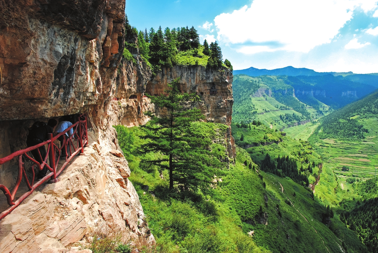 懸崖棧道位于寧武縣清真山,屬額狀丹霞巖地貌,由唐代貞元年間始建的佛教懸空古剎群與棧道共同構(gòu)成。棧道原長(zhǎng)42華里,現(xiàn)有修復(fù)段5華里及羅漢殿、毗盧殿等建筑群,其中羅漢殿“回聲階”屬全國五大回聲建筑之一。懸崖棧道的攀爬較為艱險(xiǎn),需要兩個(gè)小時(shí),途中要攀登懸崖、臺(tái)階,還要穿越僅可容一人通過的山間隧道。