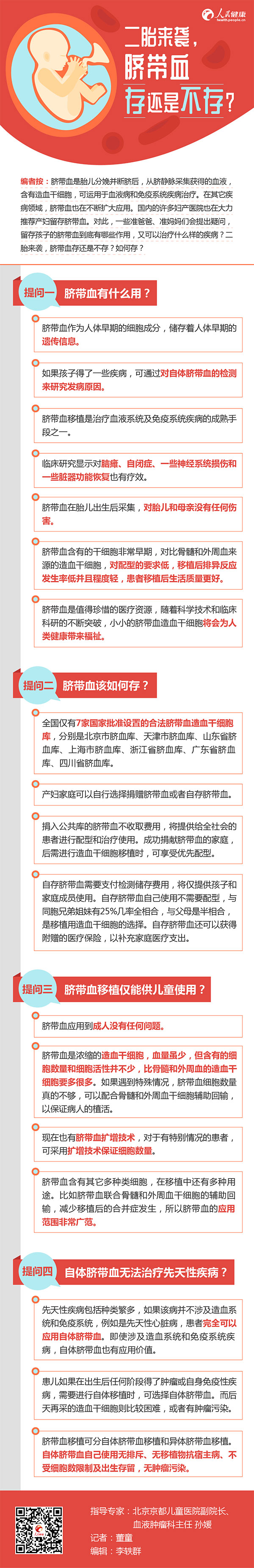 編者按:臍帶血是胎兒分娩并斷臍后,從臍靜脈采集獲得的血液,含有造血干細(xì)胞,可運(yùn)用于血液病和免疫系統(tǒng)疾病治療。在其它疾病領(lǐng)域,臍帶血也在不斷擴(kuò)大應(yīng)用。國(guó)內(nèi)的許多婦產(chǎn)醫(yī)院也在大力推薦產(chǎn)婦留存臍帶血。對(duì)此,一些準(zhǔn)爸爸、準(zhǔn)媽媽們會(huì)提出疑問(wèn),留存孩子的臍帶血到底有哪些作用,又可以治療什么樣的疾病?二胎來(lái)襲,臍帶血存還是不存?如何存?