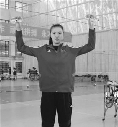 ●兩臂伸直,雙手虎口相對,掌心向后握持重物(礦泉水瓶)放在身體兩側(cè);