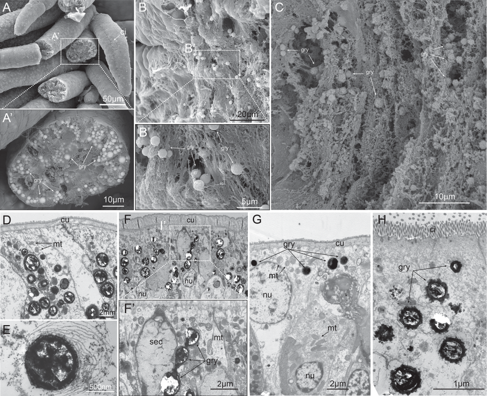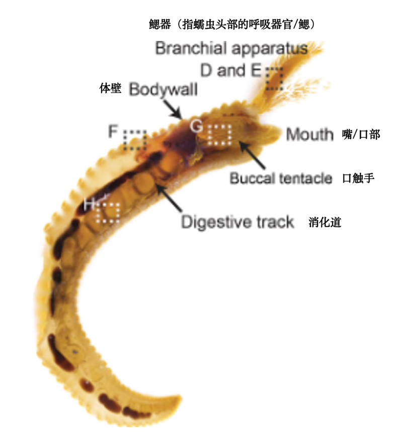 通過顯微鏡觀察,科學(xué)家發(fā)現(xiàn)蠕蟲的上皮細(xì)胞中充滿了直徑0.77-1.29微米的黃色顆粒。這些顆粒不僅存在于體表,還分布在鰓、口觸手和消化道中——所有與海水直接接觸的部位。
