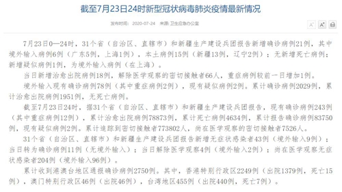 情況表示,截至7月23日24時,據(jù)31個省(自治區(qū)、直轄市)和新疆生產建設兵團報告,現(xiàn)有確診病例243例(其中重癥病例12例),累計治愈出院病例78873例,累計死亡病例4634例,累計報告確診病例83750例,現(xiàn)有疑似病例2例。累計追蹤到密切接觸者773802人,尚在醫(yī)學觀察的密切接觸者7526人。