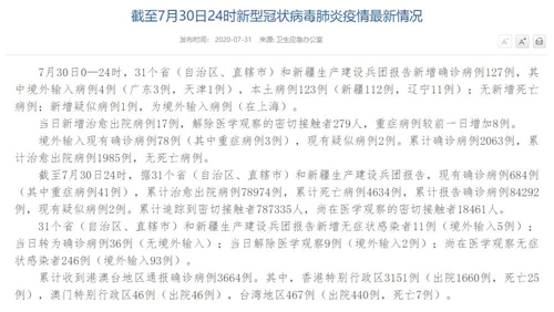 人民網北京7月31日電(董童)國家衛(wèi)生健康委于今日在官網發(fā)布的《截至7月30日24時新型冠狀病毒肺炎疫情最新情況》(以下簡稱“情況”)提出,7月30日0—24時,31個?。ㄗ灾螀^(qū)、直轄市)和新疆生產建設兵團報告新增確診病例127例,其中境外輸入病例4例(廣東3例,天津1例),本土病例123例(新疆112例,遼寧11例);無新增死亡病例;新增疑似病例1例,為境外輸入病例(在上海)。當日新增治愈出院病例17例,解除醫(yī)學觀察的密切接觸者279人,重癥病例較前一日增加8例。