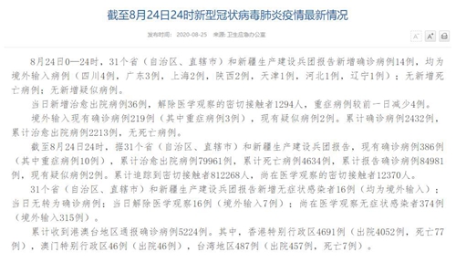 情況顯示,截至8月24日24時(shí),據(jù)31個(gè)?。ㄗ灾螀^(qū)、直轄市)和新疆生產(chǎn)建設(shè)兵團(tuán)報(bào)告,現(xiàn)有確診病例386例(其中重癥病例10例),累計(jì)治愈出院病例79961例,累計(jì)死亡病例4634例,累計(jì)報(bào)告確診病例84981例,現(xiàn)有疑似病例2例。累計(jì)追蹤到密切接觸者812268人,尚在醫(yī)學(xué)觀察的密切接觸者12370人。