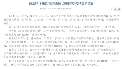 人民網(wǎng)北京8月26日電(董童)國(guó)家衛(wèi)生健康委于今日在官網(wǎng)發(fā)布的《截至8月25日24時(shí)新型冠狀病毒肺炎疫情最新情況》(以下簡(jiǎn)稱“情況”)提出,8月25日0—24時(shí),31個(gè)省(自治區(qū)、直轄市)和新疆生產(chǎn)建設(shè)兵團(tuán)報(bào)告新增確診病例15例,均為境外輸入病例(四川5例,上海4例,廣東4例,天津1例,云南1例);無(wú)新增死亡病例;無(wú)新增疑似病例。當(dāng)日新增治愈出院病例54例,解除醫(yī)學(xué)觀察的密切接觸者1249人,重癥病例較前一日減少3例。