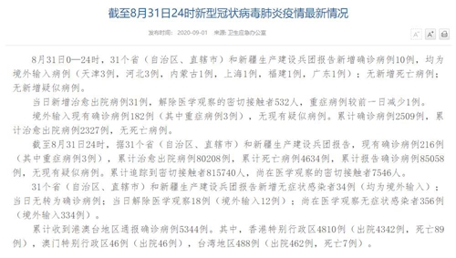 | 國家衛(wèi)健委:8月31日新增確診病例10例 均為境外輸入病例 |