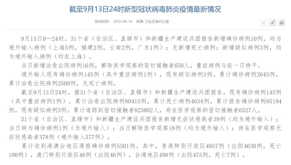 人民網北京9月14日(董童)國家衛(wèi)生健康委于今日在官網發(fā)布的《截至9月13日24時新型冠狀病毒肺炎疫情最新情況》(以下簡稱“情況”)提出,9月13日0—24時,31個?。ㄗ灾螀^(qū)、直轄市)和新疆生產建設兵團報告新增確診病例10例,均為境外輸入病例(上海5例,福建2例,云南2例,廣東1例);無新增死亡病例;新增疑似病例3例,均為境外輸入病例(均在上海)。當日新增治愈出院病例16例,解除醫(yī)學觀察的密切接觸者650人,重癥病例與前一日持平。