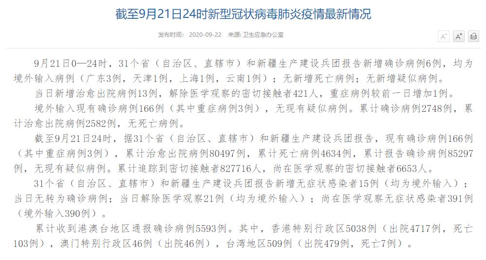 | 國家衛(wèi)健委:9月21日新增確診病例6例 均為境外輸入病例 |
