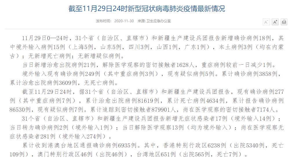 人民網(wǎng)北京11月30日電(董童)國家衛(wèi)生健康委于今日在官網(wǎng)發(fā)布的《截至11月29日24時(shí)新型冠狀病毒肺炎疫情最新情況》(以下簡稱“情況”)指出,11月29日0—24時(shí),31個(gè)?。ㄗ灾螀^(qū)、直轄市)和新疆生產(chǎn)建設(shè)兵團(tuán)報(bào)告新增確診病例18例,其中境外輸入病例15例(上海5例,山東5例,四川3例,山西1例,廣東1例),本土病例3例(均在內(nèi)蒙古);無新增死亡病例;無新增疑似病例。當(dāng)日新增治愈出院病例21例,解除醫(yī)學(xué)觀察的密切接觸者1628人,重癥病例較前一日減少1例。