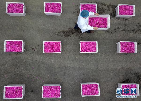 2018年4月21日,在貴州省鎮(zhèn)遠(yuǎn)縣青溪鎮(zhèn)一家以鮮花為原料釀酒的企業(yè),工人在搬運(yùn)玫瑰花(無(wú)人機(jī)拍攝)。新華社發(fā)(蔡興文 攝)