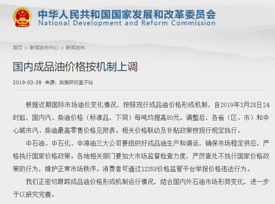 人民網(wǎng)北京3月28日電 (王紹紹) 國家發(fā)改委剛剛發(fā)布通知, 根據(jù)近期國際市場油價(jià)變化情況,按照現(xiàn)行成品油價(jià)格形成機(jī)制,自2019年3月28日24時(shí)起,國內(nèi)汽、柴油價(jià)格(標(biāo)準(zhǔn)品,下同)每噸均提高80元。調(diào)整后,各?。▍^(qū)、市)和中心城市汽、柴油最高零售價(jià)格見附表。相關(guān)價(jià)格聯(lián)動及補(bǔ)貼政策按現(xiàn)行規(guī)定執(zhí)行。
