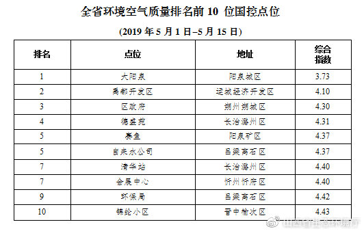 人民網(wǎng)太原5月22日電 (喬慧)5月21日,山西省生態(tài)環(huán)境廳公布2019年5月1日-5月15日全省環(huán)境空氣質(zhì)量監(jiān)測國控點位排名情況。數(shù)據(jù)顯示,環(huán)境空氣質(zhì)量較好排名第一的是陽泉城區(qū)大陽泉點位。
