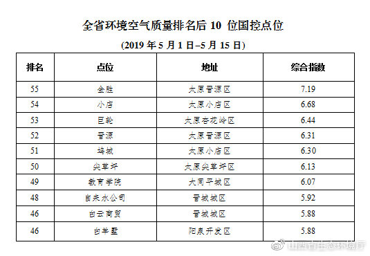 環(huán)境空氣質(zhì)量較差的后10個點位(從倒數(shù)第1名至倒數(shù)第10名)依次是:太原晉源區(qū)金勝點位、太原小店區(qū)小店點位、太原杏花嶺區(qū)巨輪點位、太原晉源區(qū)晉源點位、太原小店區(qū)塢城點位、太原尖草坪區(qū)尖草坪點位、大同平城區(qū)教育學(xué)院點位、晉城城區(qū)自來水公司點位、陽泉開發(fā)區(qū)白羊墅點位和晉城城區(qū)白云商貿(mào)點位(并列倒數(shù)第9)。
