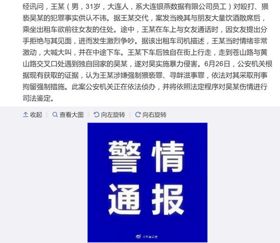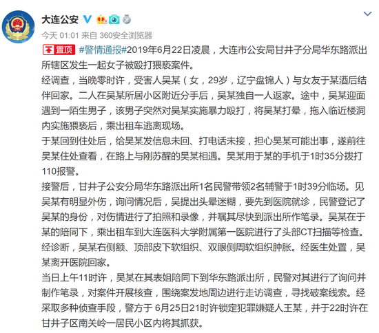 6月27日凌晨1時1分,據(jù)大連市公安局官方微博消息:2019年6月22日凌晨,大連市公安局甘井子分局華東路派出所轄區(qū)發(fā)生一起女子被毆打猥褻案件。 經(jīng)調(diào)查,當(dāng)晚零時許,受害人吳某(女,29歲,遼寧盤錦人)與女友于某酒后結(jié)伴回家。二人在吳某所居小區(qū)附近分手后,吳某獨(dú)自一人返家。途中,吳某迎面遇到一陌生男子,該男子突然對吳某實(shí)施暴力毆打,將吳某打暈,拖入臨近樓洞內(nèi)實(shí)施猥褻后,乘出租車逃離現(xiàn)場。 于某回到住處后,給吳某發(fā)信息未回、打電話未接,擔(dān)心吳某可能出事,遂前往吳某住處查看,在路上與剛蘇醒的吳某相遇。吳某用于某的手機(jī)于1時35分撥打110報(bào)警。 接警后,甘井子公安分局華東路派出所1名民警帶領(lǐng)2名輔警于1時39分臨場。見吳某有明顯外傷,詢問情況后,吳提出頭暈迷糊,要先到醫(yī)院就診,民警登記了吳某的身份,對傷情進(jìn)行了拍照和錄像,并囑其盡快到派出所作筆錄。吳某在于某的陪同下,乘出租車到大連醫(yī)科大學(xué)附屬第一醫(yī)院進(jìn)行了頭部CT掃描等檢查。經(jīng)診斷,吳某右側(cè)額、頂部皮下軟組織、雙眼側(cè)周軟組織腫脹。經(jīng)醫(yī)生處置,吳某離開醫(yī)院回家。 當(dāng)日上午11時許,吳某在其表姐陪同下到華東路派出所,民警對其進(jìn)行了詢問并制作筆錄,對案件開展核查,圍繞案發(fā)地周邊進(jìn)行走訪調(diào)查,尋找破案線索。經(jīng)采取多種偵查手段,警方于 6月25日21時許鎖定犯罪嫌疑人王某,并于22時許在甘井子區(qū)南關(guān)嶺一居民小區(qū)內(nèi)將其抓獲。 經(jīng)訊問,王某(男,31歲,大連人,系大連銀燕數(shù)據(jù)有限公司員工)對毆打、猥褻吳某的犯罪事實(shí)供認(rèn)不諱。據(jù)王某交代,案發(fā)當(dāng)晚其與朋友大量飲酒散席后,乘坐出租車欲前往女友的住處。途中,王某在車上與女友通話時,因女友提出分手拒絕與其見面,進(jìn)而發(fā)生激烈爭吵。據(jù)該出租車司機(jī)描述,王某當(dāng)時情緒非常激動,大喊大叫,并在中途下車。王某下車后獨(dú)自在街上行走,走到蒼山路與黃山路交叉口處遇到獨(dú)自回家的吳某,遂對吳實(shí)施暴力侵害。6月26日,公安機(jī)關(guān)根據(jù)現(xiàn)有獲取的證據(jù),認(rèn)為王某涉嫌強(qiáng)制猥褻罪、尋釁滋事罪,依法對其采取刑事拘留強(qiáng)制措施。此案公安機(jī)關(guān)正在依法偵辦,并將依照法定程序?qū)悄硞檫M(jìn)行司法鑒定。