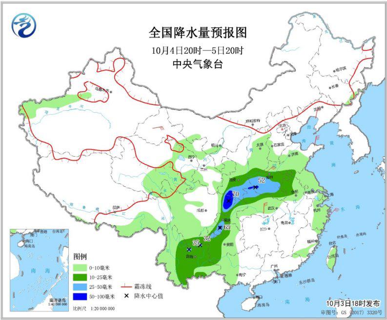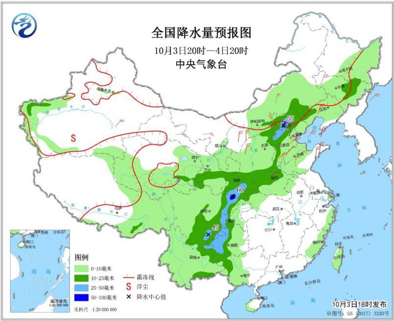 圖3 全國降水量預報圖(10月3日20時-4日20時)