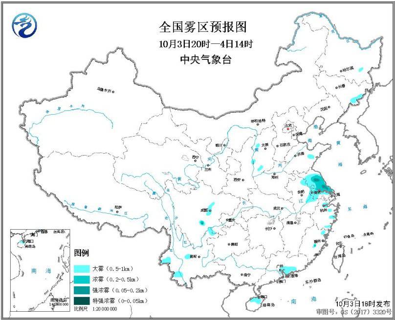 受冷空氣和降水共同影響,全國大部地區(qū)大氣擴散和清除條件較好。僅在4日至5日,新疆南疆盆地、甘肅西部以及內蒙古西部等地的部分地區(qū)有揚沙或浮塵天氣。此外,3日夜間至4日早晨,江蘇大部、浙江東部、安徽東部等地的部分地區(qū)有大霧,局地能見度不足200米,中央氣象臺于10月3日18時發(fā)布大霧預報(見圖2)。