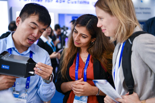 5月8日,嘉賓在第六屆全球AEO大會(huì)中國(guó)海關(guān)展臺(tái)了解手持式再生金屬分析儀。新華社記者 梁旭 攝