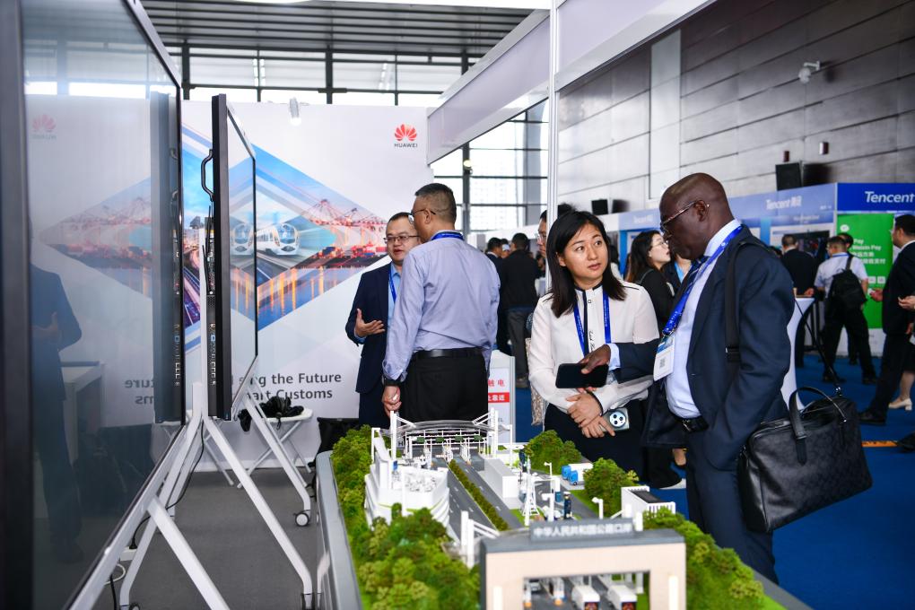 5月8日,嘉賓在第六屆全球AEO大會(huì)華為展臺(tái)了解華為智慧口岸解決方案。新華社記者 梁旭 攝