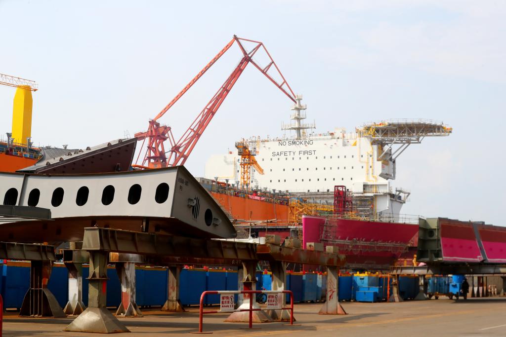 這是5月26日在上海浦東新區(qū)拍攝的上海外高橋造船有限公司生產(chǎn)工地內(nèi)景。新華社記者 龔兵攝