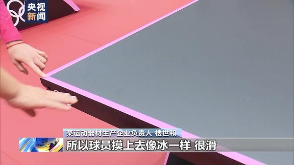某運(yùn)動器材生產(chǎn)企業(yè)負(fù)責(zé)人 樓世和:表面有高分子特殊處理,球員摸上去像冰一樣,很滑,是最新的技術(shù)。