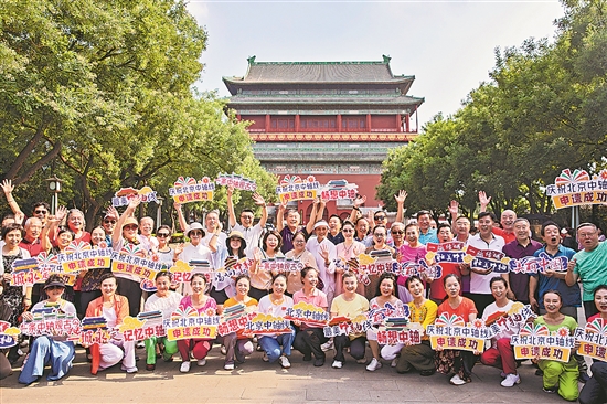 7月27日下午,眾多市民來到北京中軸線上的鐘鼓樓廣場參加北京中軸線申遺成功快閃慶?;顒印1緢笥浾?王偉偉 攝