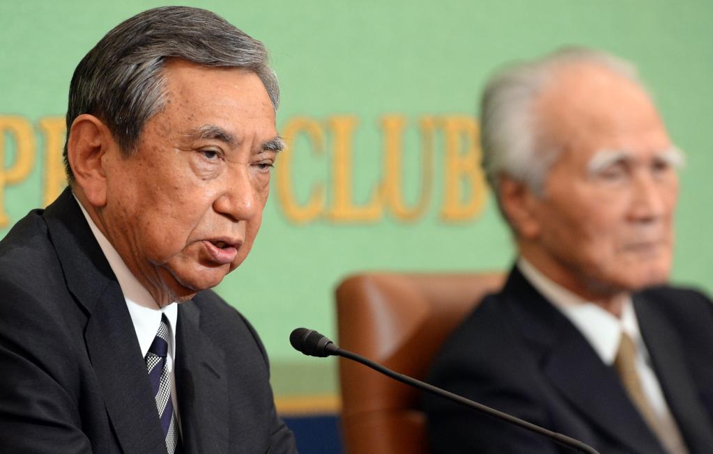 2015年6月9日,在日本東京,日本前內(nèi)閣官房長官河野洋平(左)發(fā)表講話。當(dāng)日,河野洋平和前首相村山富市在日本記者俱樂部舉行對談,重申承認(rèn)殖民侵略歷史事實(shí)、堅(jiān)持和平憲法對日本的重要意義。新華社記者馬平攝