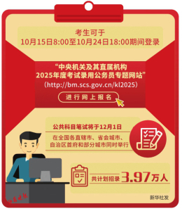 據(jù)新華社電 記者14日從國(guó)家公務(wù)員局獲悉,中央機(jī)關(guān)及其直屬機(jī)構(gòu)2025年度考試錄用公務(wù)員報(bào)名即將開始,共計(jì)劃招錄3.97萬人。考生可于10月15日8時(shí)至10月24日18時(shí)期間登錄“中央機(jī)關(guān)及其直屬機(jī)構(gòu)2025年度考試錄用公務(wù)員專題網(wǎng)站”(http://bm.scs.gov.cn/kl2025)進(jìn)行網(wǎng)上報(bào)名,公共科目筆試將于12月1日在全國(guó)各直轄市、省會(huì)城市、自治區(qū)首府和部分城市同時(shí)舉行。