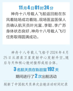 神舟十八號載人飛船于2024年4月25日從酒泉衛(wèi)星發(fā)射中心發(fā)射升空,隨后與天和核心艙對接形成組合體。3名航天員在軌駐留192天,期間進(jìn)行了2次出艙活動(dòng),刷新了中國航天員單次出艙活動(dòng)時(shí)間紀(jì)錄,完成空間站空間碎片防護(hù)裝置安裝和多次貨物出艙任務(wù),先后開展了艙內(nèi)外設(shè)備安裝、調(diào)試、維護(hù)維修等各項(xiàng)工作,為空間站長期穩(wěn)定在軌運(yùn)行進(jìn)一步積累了寶貴的數(shù)據(jù)和經(jīng)驗(yàn);同時(shí),還在地面科研人員密切配合下,完成了涉及微重力基礎(chǔ)物理、空間材料科學(xué)、空間生命科學(xué)、航天醫(yī)學(xué)、航天技術(shù)等領(lǐng)域的大量空間科學(xué)實(shí)(試)驗(yàn)。