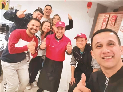 吳紹華(中)與到店顧客合影留念。受訪者供圖