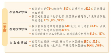 分領(lǐng)域看,在消費(fèi)品領(lǐng)域,一季度,我國進(jìn)口的72%的箱包、51.7%的乘用車、42.2%的化妝品來自歐盟,我國對歐盟出口電子電器、服裝及衣著附件、日化用品同比分別增長7.7%、3%、16.1%。
