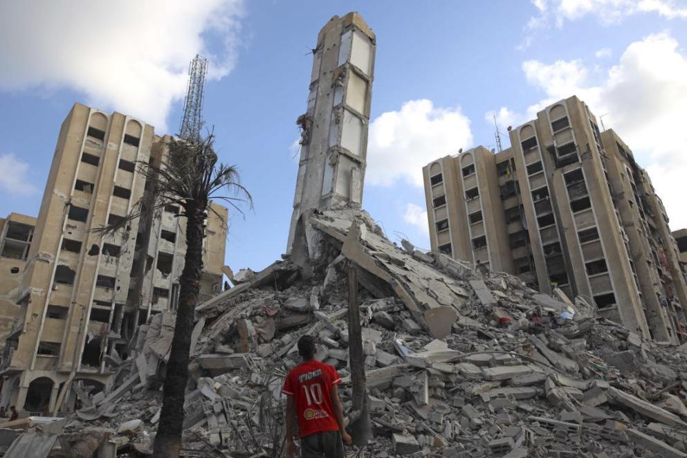 ??2024年7月26日,在加沙地帶中部努賽賴特難民營,一名男子查看一片建筑廢墟。新華社發(fā)(馬爾萬·達(dá)烏德攝)