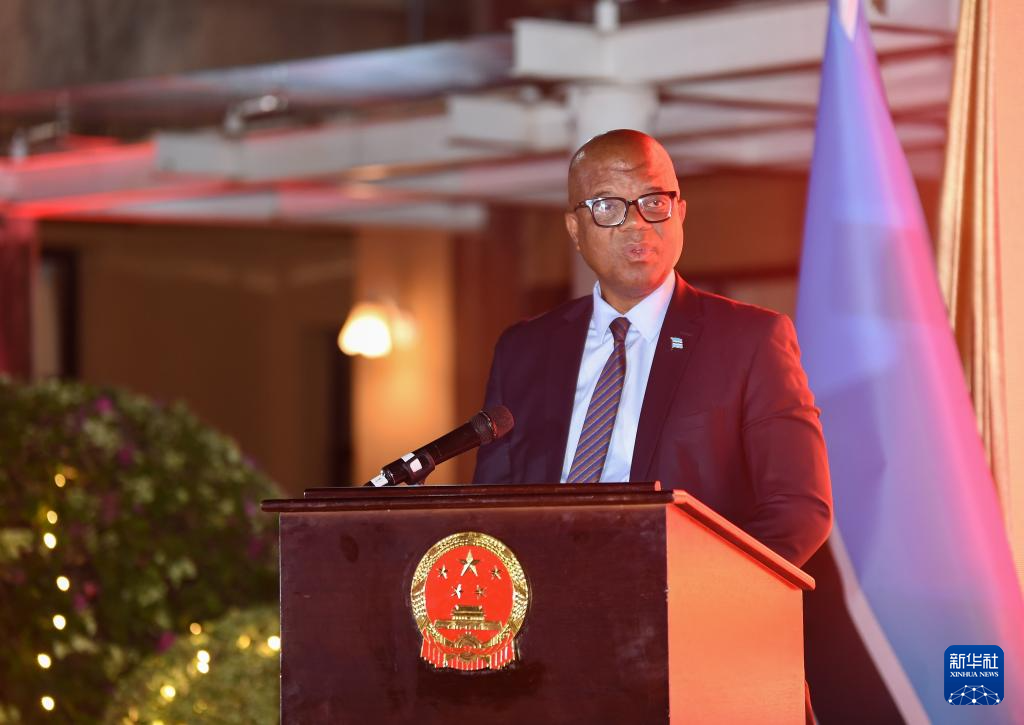 9月25日,在博茨瓦納首都哈博羅內,博茨瓦納總統(tǒng)事務部長莫瓦薩在慶祝中華人民共和國成立76周年招待會上講話。新華社發(fā)(策基索·特巴洛攝)