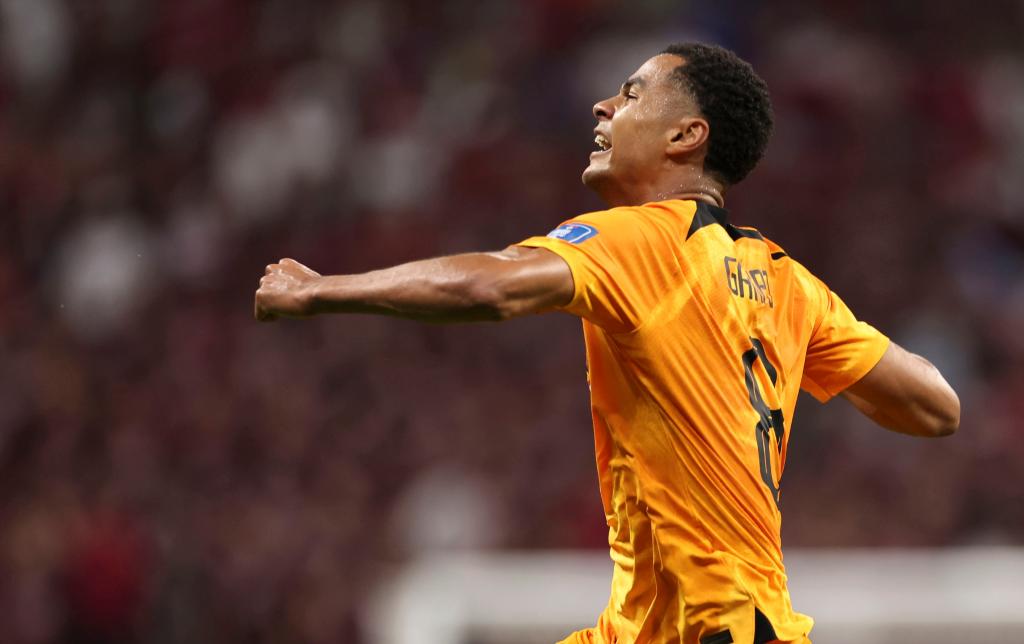 11月29日,荷蘭隊球員科迪·加克波在比賽中進(jìn)球后慶祝。新華社記者 徐子鑒 攝 當(dāng)晚在海灣球場,A組的歐洲勁旅荷蘭隊2:0輕松擊敗東道主卡塔爾隊,前者小組出線,后者結(jié)束賽程。 第26分鐘,加克波在禁區(qū)前得球后果斷突入禁區(qū),勁射遠(yuǎn)角得手。這位埃因霍溫前鋒連續(xù)三場都有進(jìn)球。 第49分鐘,德佩在近門柱小角度勁射被撲出,德容拍馬趕到,補射破門。全場掌控節(jié)奏的荷蘭隊輕松過關(guān)。 賽前,兩連敗的卡塔爾隊已無緣16強(qiáng)。此役過后,據(jù)國際足聯(lián)統(tǒng)計,卡塔爾隊成為世界杯歷史上第一支小組賽三場都輸、積零分的東道主球隊。