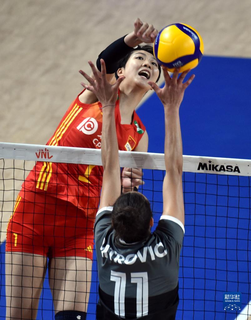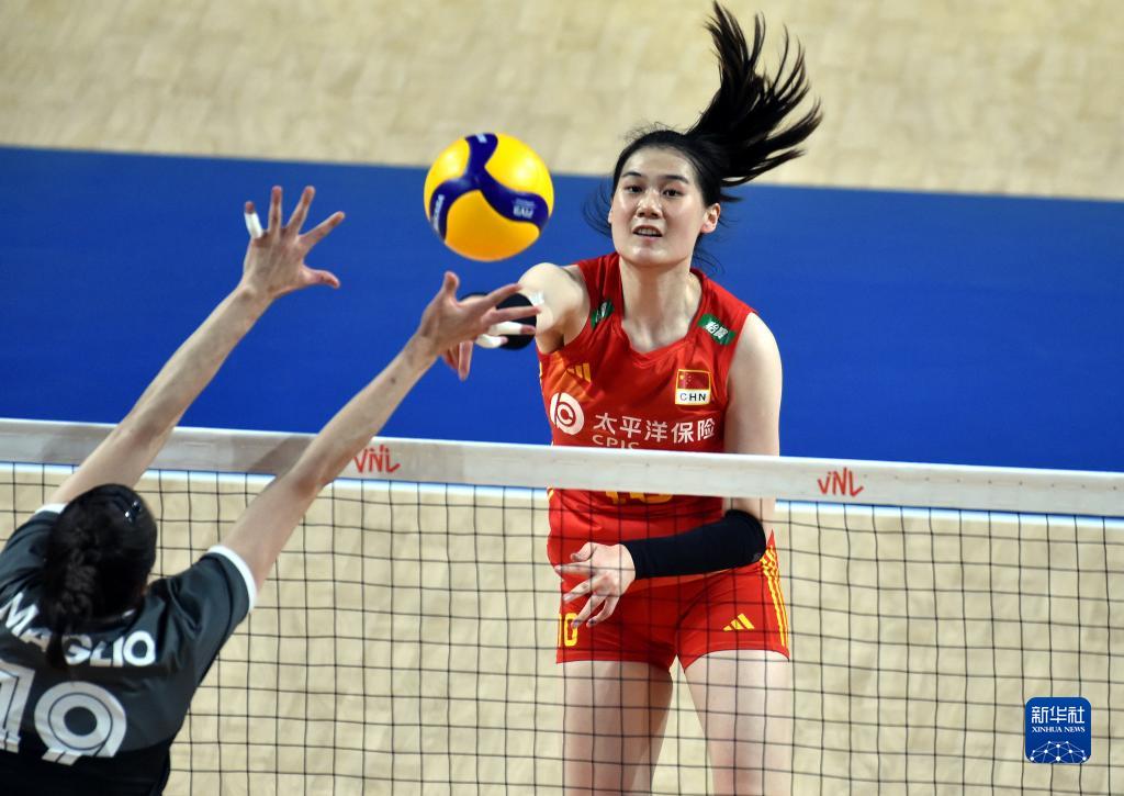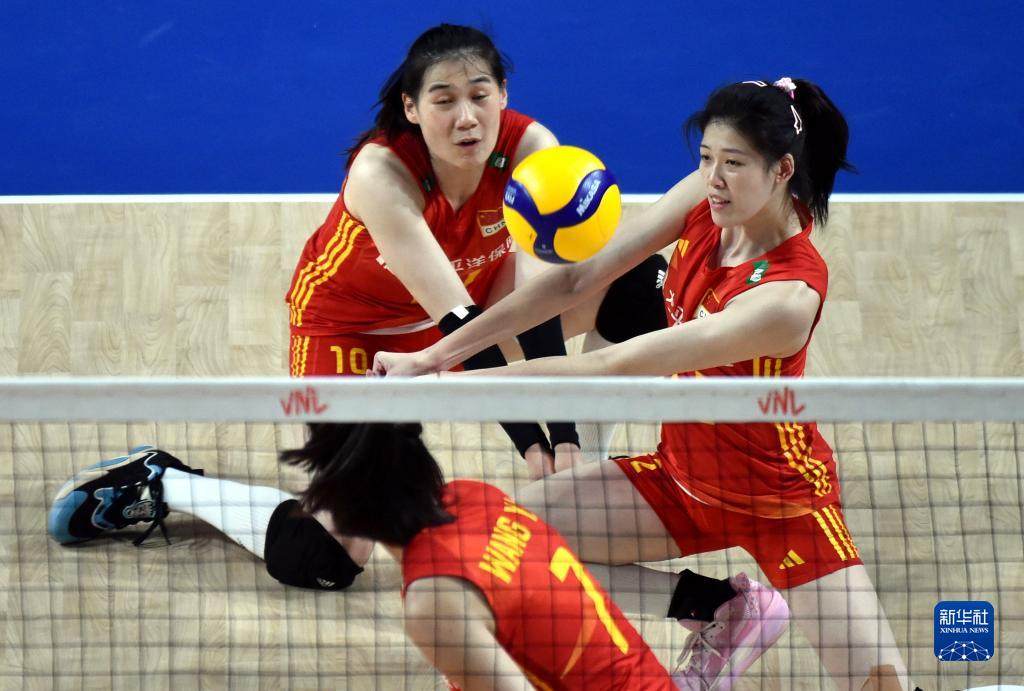 6月13日,中國(guó)隊(duì)球員袁心玥(上)在比賽中扣球。新華社記者盧炳輝攝