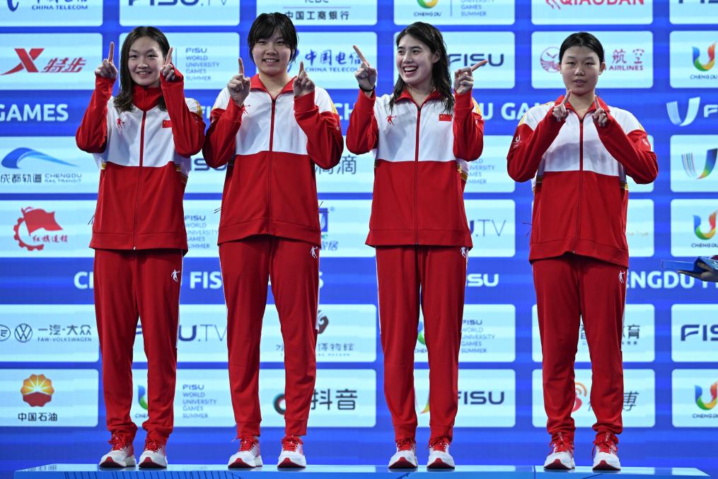 從日本福岡世錦賽凱旋的世界“蛙王”覃海洋和“蝶后”張雨霏當(dāng)天凌晨才到成都,隨即刷新男子100米蛙泳和女子50米蝶泳的賽會(huì)紀(jì)錄。張雨霏還率領(lǐng)中國(guó)隊(duì)以3分37秒51的成績(jī)創(chuàng)造了女子4x100米自由泳接力賽會(huì)紀(jì)錄,開(kāi)啟成都大運(yùn)會(huì)游泳奪金之旅。