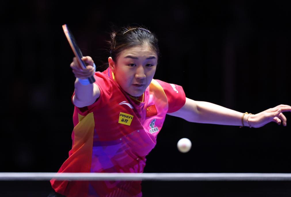2月21日,中國隊(duì)球員陳夢在第一盤比賽中回球。新華社記者 楊世堯 攝