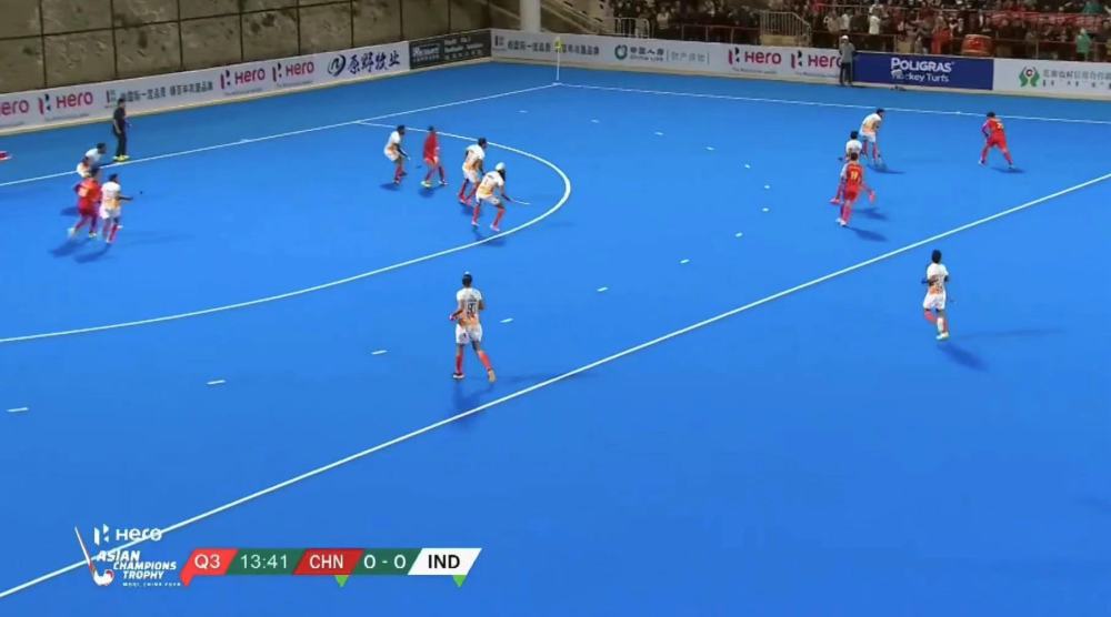 在冠軍爭(zhēng)奪戰(zhàn)中,中國(guó)隊(duì)迎戰(zhàn)實(shí)力強(qiáng)勁的印度隊(duì)。比賽一開始,雙方便展開激烈對(duì)攻,印度隊(duì)幾次制造威脅,均被中國(guó)隊(duì)輕松化解。第一節(jié)比賽進(jìn)行到10分鐘左右時(shí),印度隊(duì)連續(xù)獲得兩次短角球機(jī)會(huì),但均未能取得進(jìn)球。隨后印度隊(duì)試圖通過(guò)長(zhǎng)傳配合射門,也被中國(guó)隊(duì)守門員成功防住。