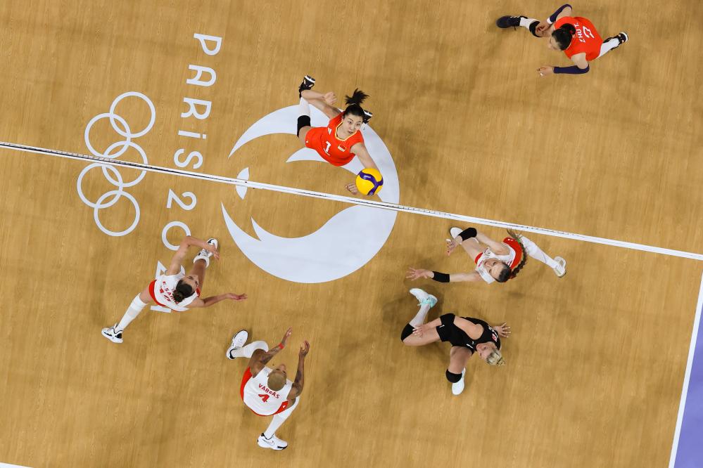 8月6日,中國隊隊員袁心玥(中)在巴黎奧運會女子排球四分之一決賽中。新華社記者 陳益宸 攝