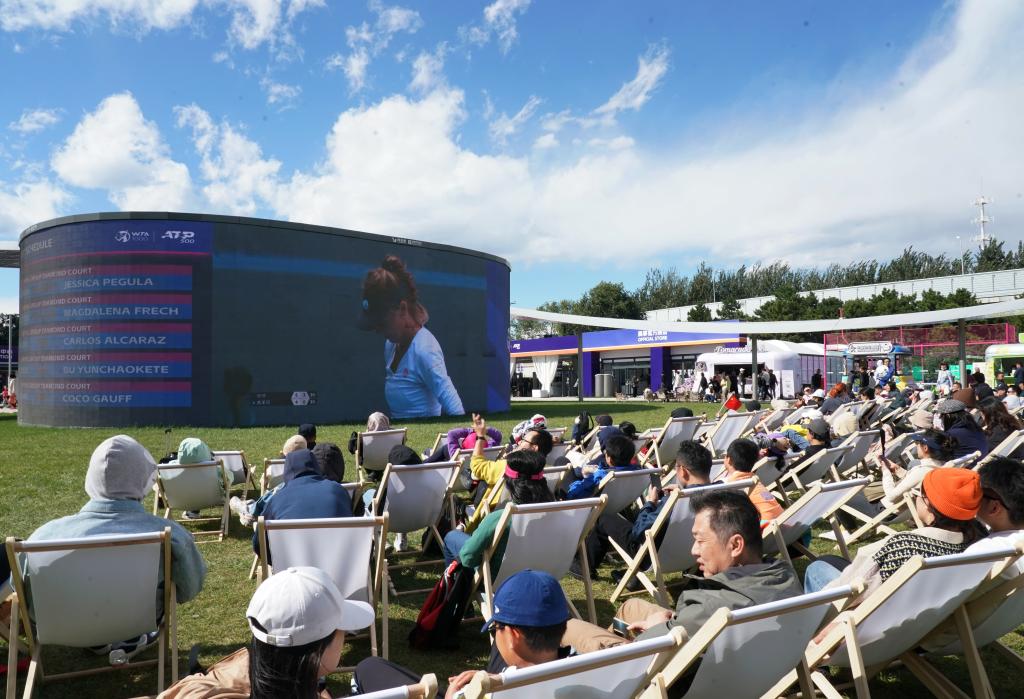 10月1日,在北京國家網(wǎng)球中心,游客在躺椅上觀看中國網(wǎng)球公開賽賽事直播。新華社記者 張晨霖 攝