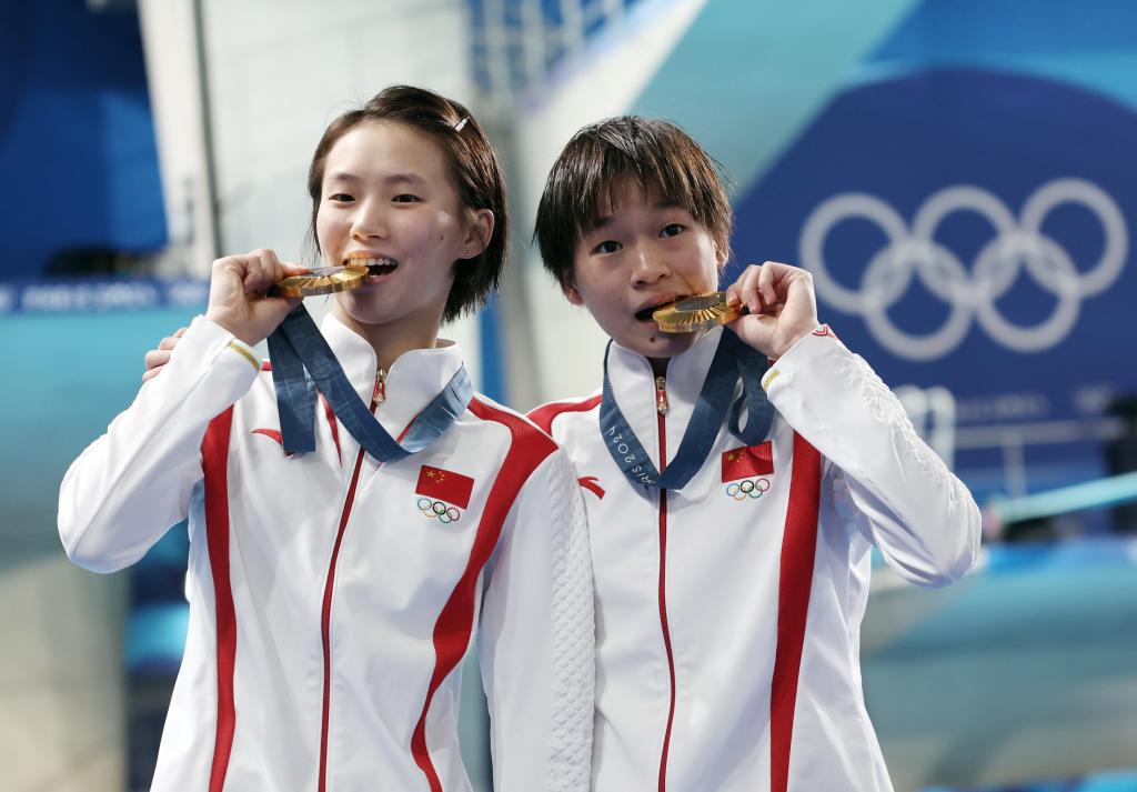 7月31日,冠軍中國選手陳芋汐(左)/全紅嬋在頒獎儀式上。當日,在巴黎奧運會跳水女子雙人十米臺決賽中,陳芋汐/全紅嬋奪得金牌。新華社記者 張玉薇 攝