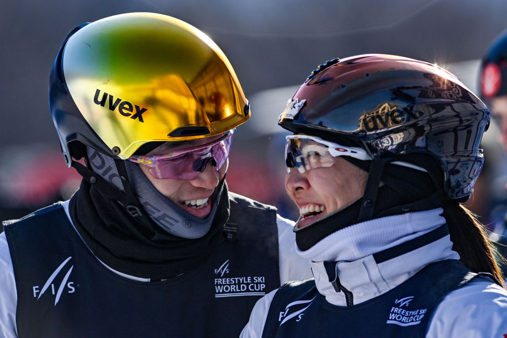 2月24日,中國(guó)隊(duì)李天馬(左)與徐夢(mèng)桃在比賽后慶祝。新華社記者 顏麟蘊(yùn) 攝